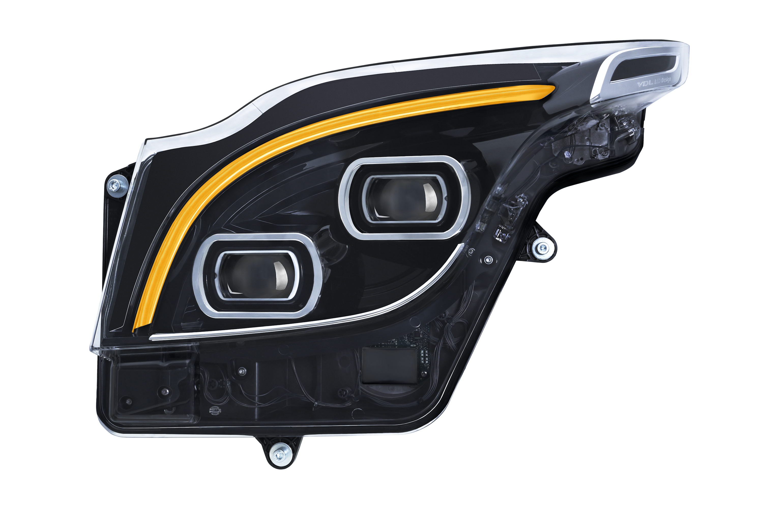 Além da iluminação frontal, a Forvia Hella contribuiu com soluções de iluminação e eletrónica complementares, incluindo luzes de posição no teto, iluminação interior, avisadores de marcha-atrás e sensores avançados de bateria e chuva-luz, para melhorar a segurança, o conforto e a identidade visual da série VDL Futura 3.